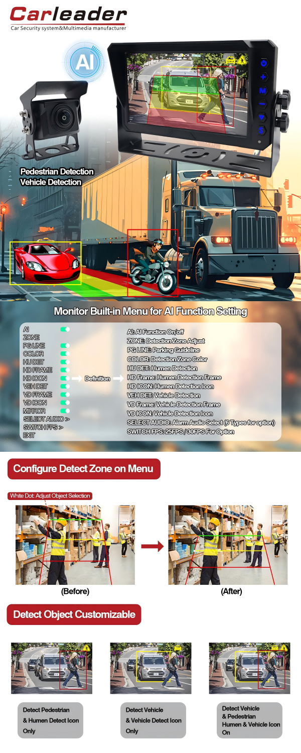 Carleader 7 Inch AI BSD Ifoju Iwari Iwari Eto Abojuto Eto Atilẹyin AI Calibration jẹ apẹrẹ pẹlu awọn algoridimu giga-giga AI to ti ni ilọsiwaju ati iṣẹ ore-ọrẹ olumulo cz. Eto kamẹra AI yii n pese awọn awakọ pẹlu gbogbo oju-ọjọ, ẹlẹsẹ-konge giga ati awọn ikilọ agbara ọkọ, ni imunadoko idinku eewu ti awọn ijamba ọkọ. Eto kamẹra ibojuwo AI dara fun awọn ọkọ ayọkẹlẹ aladani, awọn ọkọ oju-omi kekere ti iṣowo ati awọn ọkọ ayọkẹlẹ pataki. Eto AI ti ọkọ oju-omi titobi ni isọpọ ti o lagbara ati ibaramu, agbara ati awọn agbara ibojuwo akoko gidi.