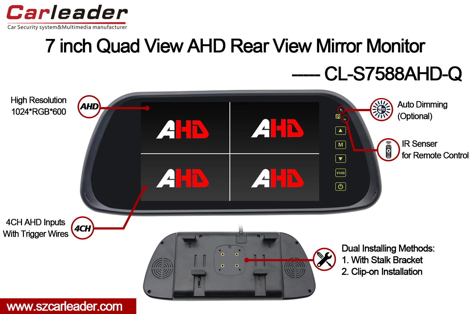 Igbesoke si awọnCarleader7 inch 4CH Quad AHD Rear View Mirror Monitor Support Meji fifi sorifun hihan ti ko ni afiwe, igbẹkẹle, ati ifọkanbalẹ ti ọkan lori ọna.