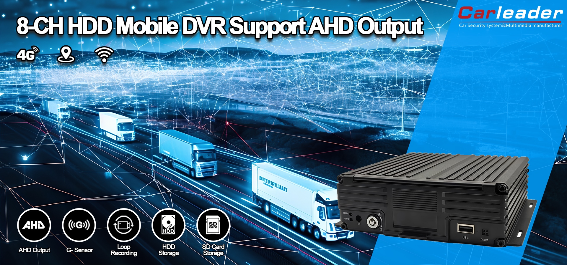 Carleader8CH 1080P HDD Mobile DVR Atilẹyin AHD Ijade Apẹrẹ Fun iṣakoso ọkọ oju-omi kekere ati ipasẹ, aabo ọkọ oju-irin ilu, agbofinro ati awọn ọkọ pajawiri, awọn eekaderi ati gbigbe ẹru, ikọkọ ati aabo ọkọ ayọkẹlẹ ti iṣowo