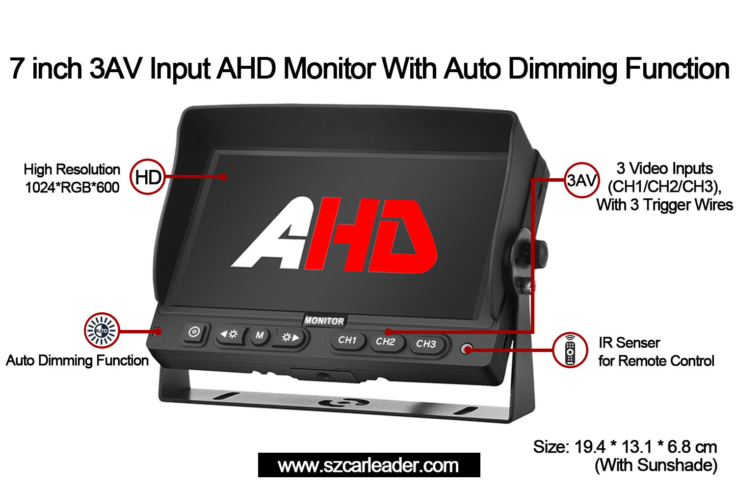 Carleader7 inch 3CH AHD Awọn titẹ sii Atẹle Afẹyinti Ọkọjẹ atẹle AHD 7-inch ti o lagbara ti a ṣe apẹrẹ fun isọpọ ailopin sinu iṣọra ati awọn eto adaṣe. Ni ifihan nronu Innolux oni-nọmba kan pẹlu ipin 16: 9 kan, o nfi awọn iwoye agaran han ni ipinnu 1024xRGBx600, ni idaniloju mimọ fun awọn ohun elo to ṣe pataki. Paapaa wa pẹlu titẹ sii fidio AHD ikanni 3 lati baamu pupọ julọ iwulo iran ọkọ.