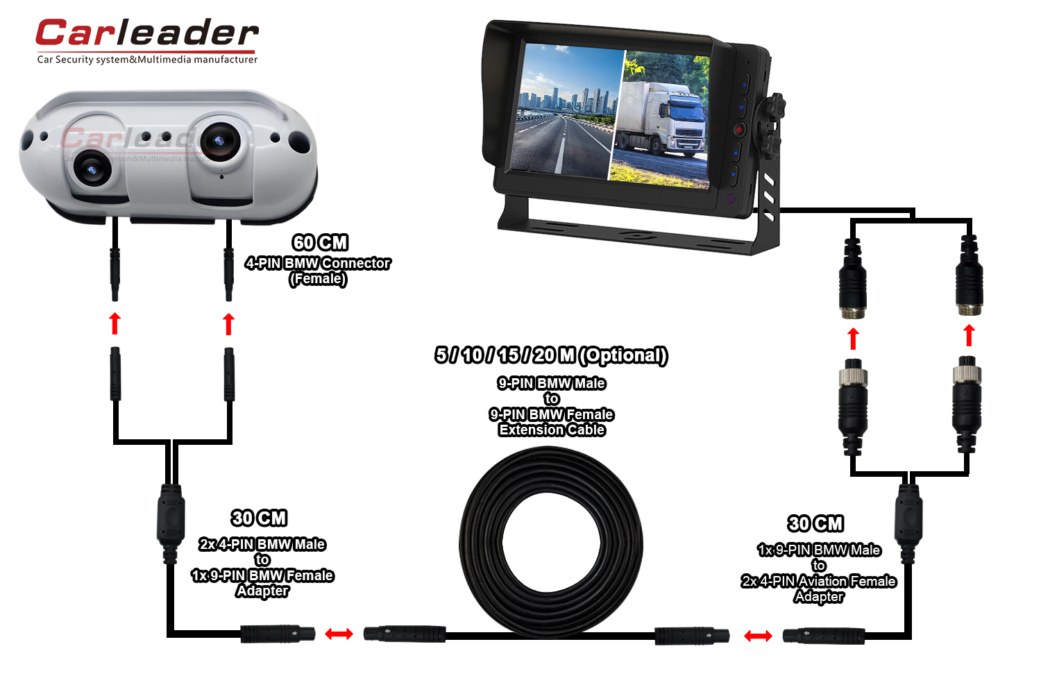 Ojutu akọkọ nikan lo okun itẹsiwaju kan (asopọ BMW 9-PIN), okun pipin 1 si 2 fun opin mejeeji lati sopọ kamẹra ati atẹle. Nitoripe ojutu yii nikan wa lori okun itẹsiwaju, eyiti o jẹ ki ilana fifi sori ẹrọ rọrun ati irọrun diẹ sii.