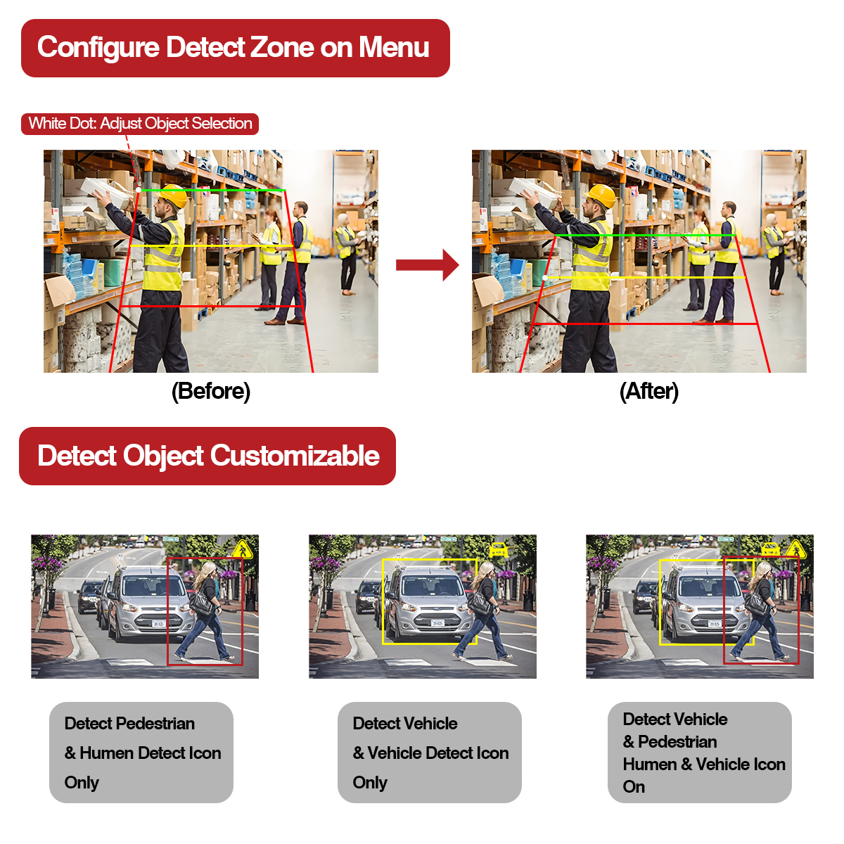 Kamẹra AI yii pẹlu iṣẹ ina ikilọ ti a ṣe sinu, awọ ina yoo yipada si awọ ti o baamu nigbati ohun wiwa ba wọ agbegbe wiwa oriṣiriṣi (Pupa, Yellow, Green). Tun ṣepọ pẹlu itaniji si itaniji agbegbe ẹlẹsẹ ati ọkọ ti o sunmọ ọkọ rẹ.
